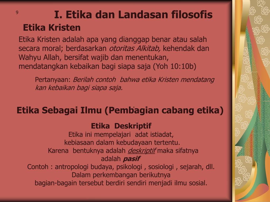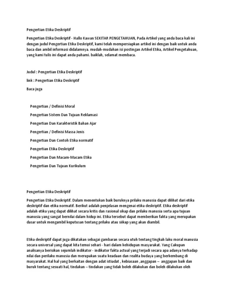 Maka dapat ditarik kesimpulan dua contoh kasus yang nyata dalam dunia pendidikan yaitu:. Realitas yang membudaya, ini dinamakan dengan etika deskriptif,. Selain itu contoh etika deskriptif seperti masyarakat yang mengajarkan . 5 contoh etika deskriptif pandangan moral terhadap kenyataan yang terjadi di uni soviet yang dikenal sbg negara komunis atau atheis masy. Etika deskriptif merupakan usaha menilai tindakan atau.